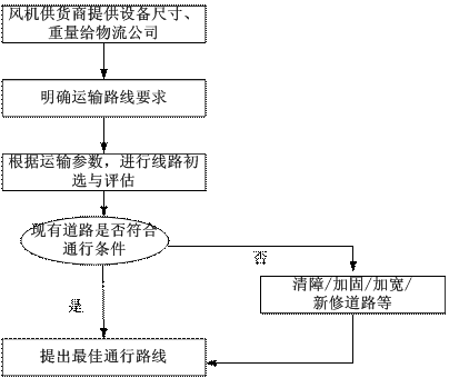 风机设备的运输通常是通过外包、招投标方式,由供货商运送到指定机位。由于风机设备具有超长、超宽、超高、超重的特征之一,运输道路成为其运输的基础。为了保证运输能顺利进行,物流公司要用半年左右甚至更长的时间来完成前期的运输选线、路勘、清障等工作,形成一套选择运输路线的方法。